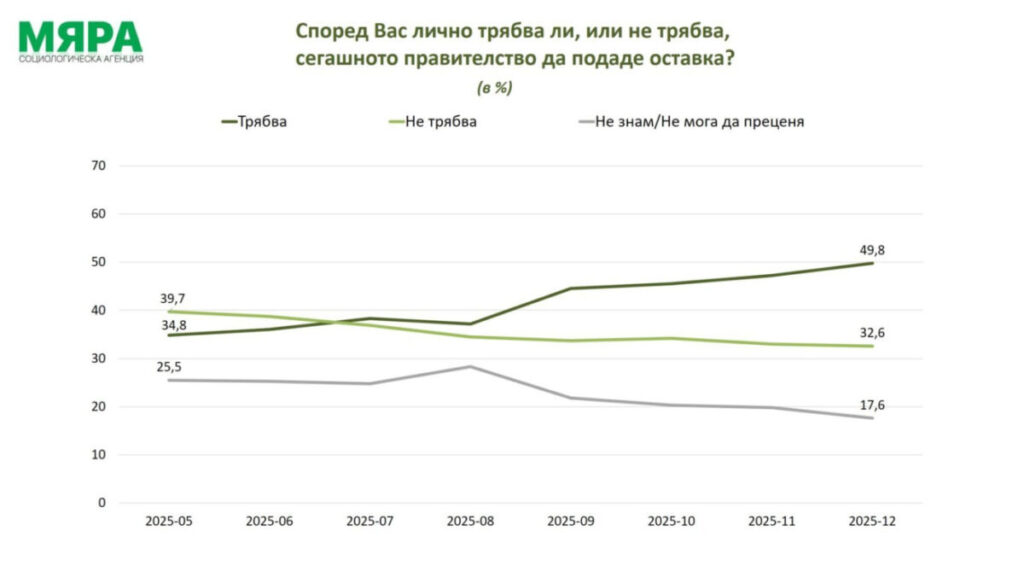 Половината (49,8%) искат правителството да подаде оставка, 32,6% не искат, а 17,6% се колебаят.